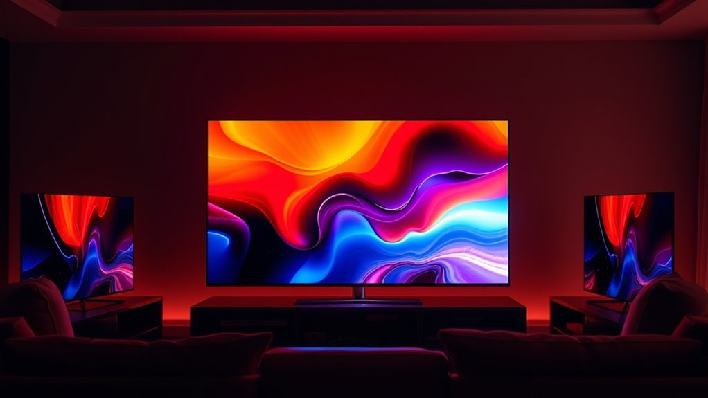 HDR support like Dolby Vision or HDR10+ plays a crucial role in delivering vibrant, lifelike colors on an OLED TV. These formats provide dynamic contrast, enhancing highlights and shadows for richer detail. Thanks to self-lit OLED pixels, you get precise control over brightness at the pixel level, resulting in more accurate and vivid colors. Certifications like Pantone Validation ensure the TV displays colors with high fidelity, matching industry standards. Proper color calibration and advanced processing technologies, such as AI-driven upscaling, help produce consistent, true-to-life colors across different content. When comparing HDR formats and color validation certifications, you can better identify OLED TVs that deliver the most accurate and vibrant visuals. Prioritizing these aspects guarantees a more immersive viewing experience for Cyber Monday deals.