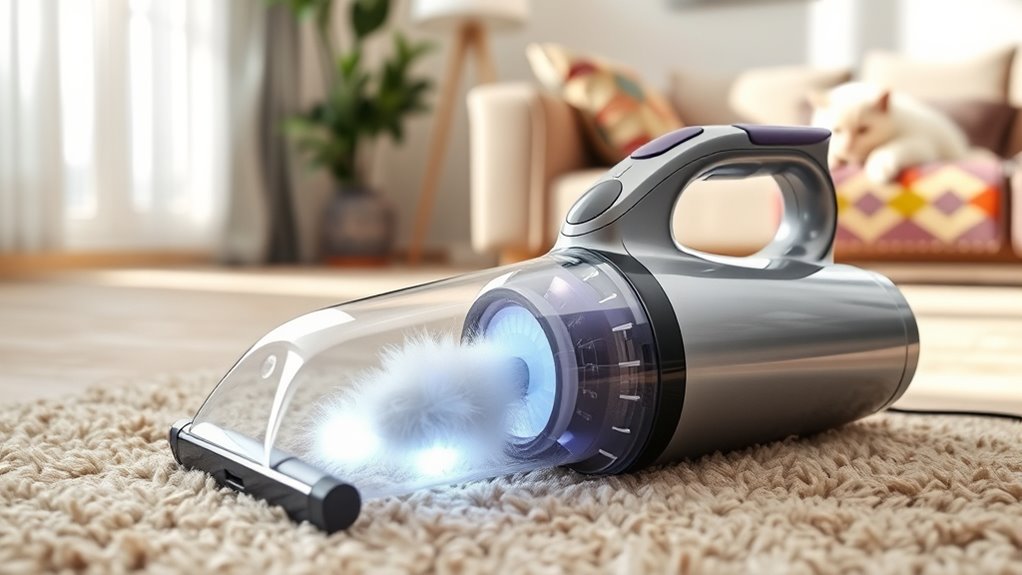 Choosing a pet hair vacuum with a HEPA filter means paying close attention to its filtration efficiency, which directly affects how well it captures airborne allergens. HEPA filters are rated to trap at least 99.97% of particles as small as 0.3 microns, making them highly effective for allergen reduction. However, not all HEPA filters are equal—true HEPA filters offer the highest effectiveness, while HEPA-like or medical-grade filters may vary slightly. The vacuum’s sealed system also plays a vital role, ensuring all air passes through the filter without leaks. Regularly cleaning or replacing the filter is essential to maintain peak efficiency over time. This focus on filtration efficiency helps keep your indoor air cleaner and minimizes pet dander, dust, and pollen.