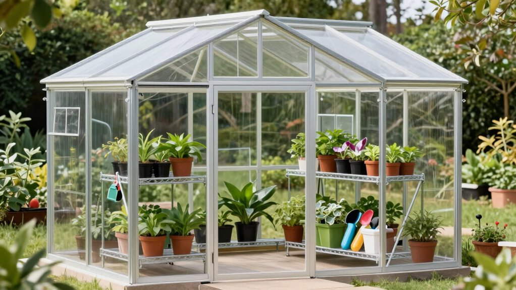 Choosing the right polycarbonate greenhouse with shelving isn’t just about size or style; it’s about balancing durability with accessibility. Like a well-crafted symphony, the perfect fit combines sturdy construction with thoughtful organization. Whether you prioritize ventilation or locking doors, the options are diverse. Ultimately, finding that ideal greenhouse means harmonizing your gardening ambitions with practical features—because a thriving garden isn’t just planted; it’s cultivated with care and purpose.