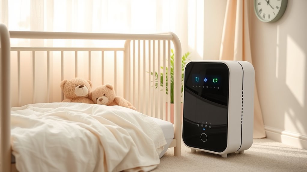 I’ve found that noise levels around 30 decibels are ideal for nighttime nursery use, as they mimic a whisper or rustling leaves. Research suggests that sounds below this threshold won’t disturb a baby’s sleep. I always look for air purifiers with adjustable noise settings, so I can keep the environment calm and peaceful. It’s crucial to prioritize quiet operation to make certain your little one sleeps soundly through the night.
