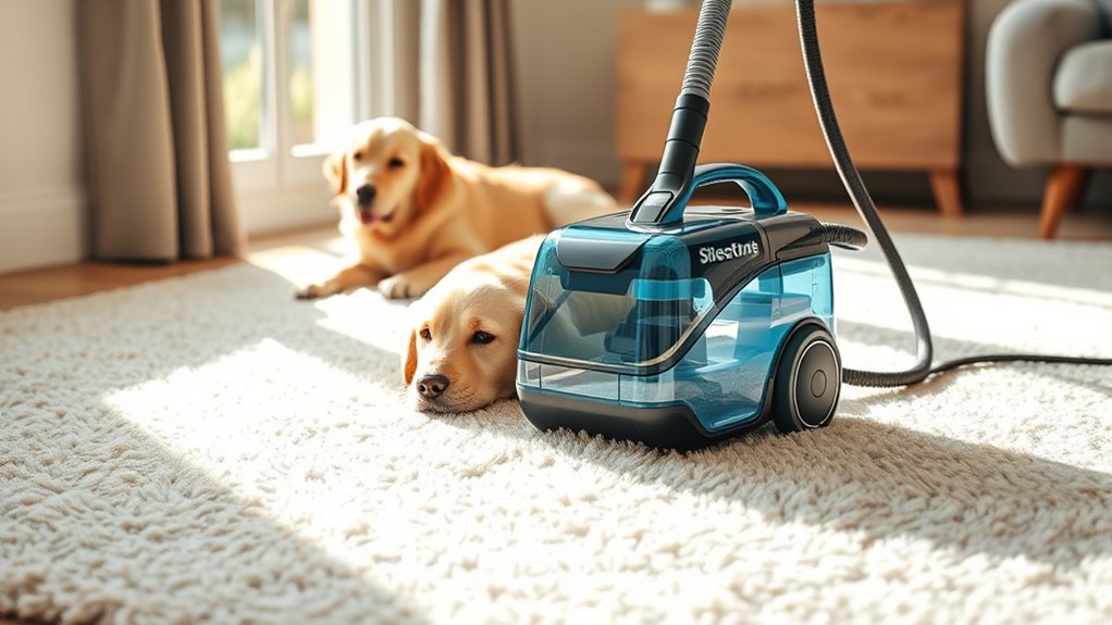 When it comes to cleaning up pet messes, ease of use and portability can make a big difference in how effectively and quickly you can tackle stains. A lightweight cleaner, ideally under 10 pounds, is much easier to carry and maneuver, especially when dealing with multiple rooms or stairs. Compact designs with handles or straps make transporting the device simple, while long cords and hoses help reach tricky spots like upholstery or under furniture without constant repositioning. User-friendly features, such as straightforward trigger controls and easy tank access, simplify operation during stressful messes. Additionally, self-cleaning systems or removable parts reduce setup time, allowing you to focus on getting your home clean fast. These factors guarantee your cleaning routine is less cumbersome and more efficient.