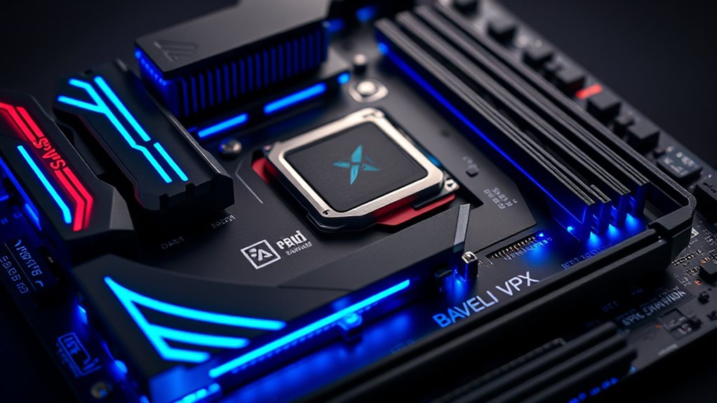 Selecting a premium AMD motherboard isn’t just about compatibility; it also means ensuring it can handle the power demands of high-performance CPUs. High-quality boards feature robust power delivery systems with multiple phases, like 12+2 or 16+2, to keep voltage stable during overclocking and intensive tasks. Effective cooling solutions are essential, including large heatsinks, thermal pads, heat pipes, and M.2 shields Frozr, which prevent thermal throttling and maintain peak performance. Adequate VRM cooling is crucial for high-core-count CPUs, preventing overheating and ensuring reliable power delivery during extended gaming sessions. Good thermal management also involves strategic airflow design, with integrated I/O covers and finned VRM heatsinks. These features are vital for achieving overclocking stability, extending component lifespan, and maintaining consistent gaming performance.