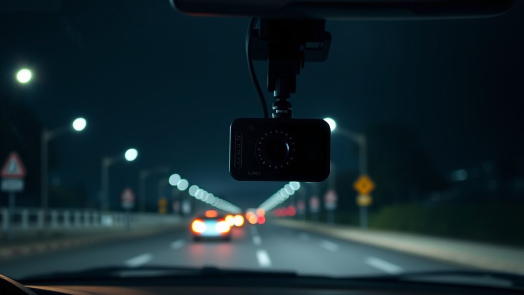 Night vision capabilities greatly improve low-light recording quality by enhancing visibility in dark conditions. I’ve seen how these features use infrared technology or advanced sensors to capture clearer images when lighting is poor. This means I can record details like license plates or road signs even at night. Overall, night vision guarantees my footage remains sharp and useful, providing better security and peace of mind while driving in low-light environments.