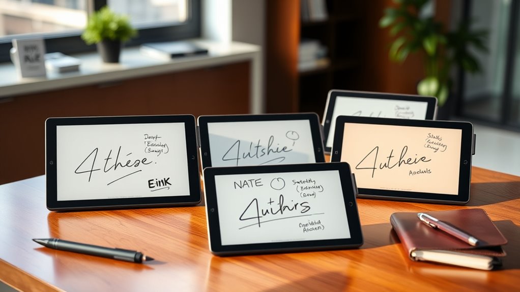 A premium e-ink tablet’s stylus sensitivity and features are crucial for an ideal note-taking experience. High pressure sensitivity, like 8192 levels, allows for precise, natural handwriting and detailed sketches. Support for tilt and angle detection adds shading and variable line thickness, making annotations more realistic. Features such as battery-free, passive styluses with built-in erasers and customizable shortcut buttons boost efficiency and convenience. Advanced stylus technology often includes low latency, under 50 milliseconds, ensuring smooth, responsive writing. Compatibility with multiple pen tip types and adjustable pressure curves lets me personalize the stylus experience for different tasks, whether jotting quick notes or creating detailed illustrations. These features make a significant difference in how seamlessly I can capture ideas on an e-ink tablet.
