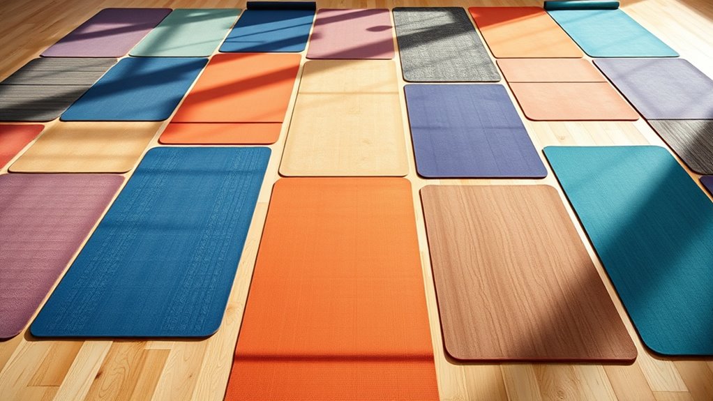 Mat texture plays a vital role in slip resistance and joint safety. I look for mats with a textured surface because they provide better grip, even when sweaty, reducing the risk of slipping. A non-slip texture helps me stay stable during poses, which protects my joints from unnecessary strain or injury. Overall, choosing a mat with the right texture guarantees I can practice comfortably and safely, enhancing my confidence on the mat.