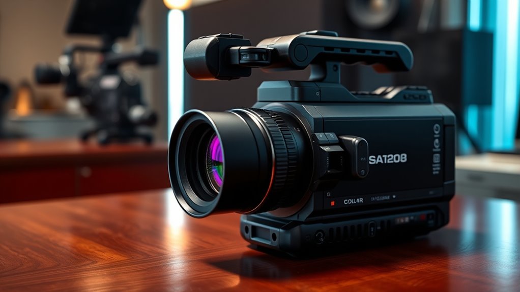 Choosing the right resolution and frame rate is crucial because these factors directly affect the quality and usability of your footage. Higher resolutions like 4K and 8K deliver more detail, making footage suitable for professional editing and large displays. They also give you more flexibility in post-production. Frame rates such as 60FPS or higher ensure smoother motion, which is indispensable for fast-paced sports or action scenes. Keep in mind, higher resolution and frame rates lead to larger file sizes, impacting storage and workflow. The best choice depends on your final output—cinematic, streaming, or broadcast. Many professional camcorders offer multiple options, allowing you to adapt to different shooting conditions and post-production needs. Selecting the appropriate resolution and frame rate helps you achieve the desired cinematic quality efficiently.