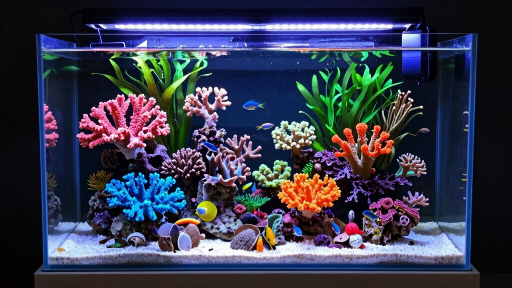 Have you considered how your reef tank’s lighting can make or break coral health and visual appeal? Effective all-in-one kits feature adjustable LED lighting with spectrum options tailored for coral growth. Many include app-controlled systems, letting you easily customize color, brightness, and schedules to mimic natural daylight cycles. High-quality lighting typically offers a color temperature around 7500K to 10,000K, simulating sunlight for ideal marine plant and coral health. Multi-color LEDs like RGB and white allow for dynamic lighting effects, enhancing the tank’s appearance and creating natural environments. Proper coverage and intensity are essential to maintain vibrant coral pigmentation and prevent algae overgrowth. Ensuring your kit’s lighting can be fine-tuned to your specific reef ecosystem needs is crucial for a thriving, beautiful reef tank.