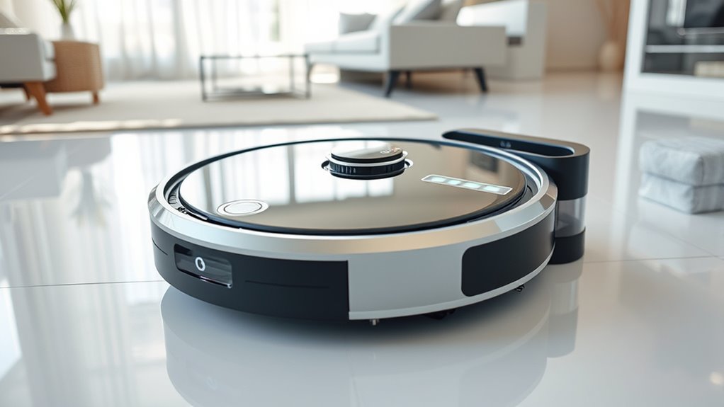 A key factor to consider in robotic mops with auto-cleaning bases is their self-emptying capacity, which directly affects how often you’ll need to empty the debris bin. Larger capacities, like 2.7 liters or more, allow the robot to operate for weeks without manual intervention, reducing maintenance. The self-emptying feature usually involves a sealed bag or bin in the docking station that automatically collects debris from the robot, making the process effortless. This is especially beneficial for homes with pets or high dust levels, as it minimizes user interaction. The capacity of the self-emptying station determines how long the robot can clean continuously before needing attention, ensuring more convenience and less frequent emptying. This capacity is a vital factor for a truly hands-free cleaning experience.