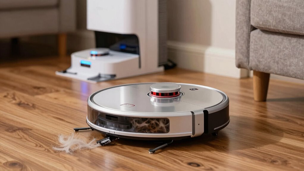 Choosing a self-emptying robot vacuum for pet hair hinges on its suction power, as this determines how well it can lift hair from different surfaces. A minimum of 4,000 Pa is necessary to effectively remove pet hair and debris from carpets and hard floors. For homes with heavy shedding, higher suction levels, like 10,000 Pa, can considerably improve cleaning performance. Adequate suction prevents pet hair from tangling or being left behind, reducing manual clean-up. If suction is insufficient, pet hair tends to accumulate, decreasing efficiency and increasing the need for manual intervention. I recommend selecting a model with adjustable suction settings so you can customize power based on the floor type and pet hair volume, ensuring ideal cleaning results every time.