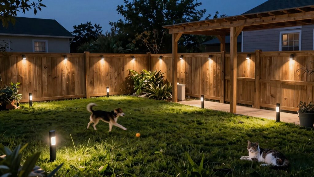 Smart lights improve safety for pets outdoors by automatically turning on when they detect motion, which helps prevent accidents in dark or dim areas. I love how they alert me if my pets wander too close to hazards or leave designated safe zones. With remote control and customizable settings, I can guarantee my pets are always visible and protected, giving me peace of mind during evening or nighttime outdoor activities.