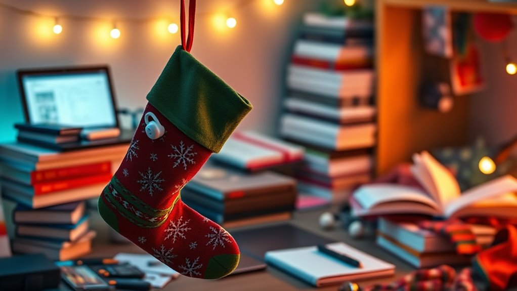 To select the perfect stocking stuffer for a college student, it’s vital to take into account their personal interests and hobbies. Consider what excites them—music, gaming, sports, or art—and choose items that enhance those passions. Practical accessories, like portable chargers for tech lovers or quality art supplies for creative students, make thoughtful gifts. Personalization adds extra meaning—think about their favorite colors, themes, or symbols to tailor the gift. Supporting their hobbies with items like workout gear for fitness buffs or cooking gadgets for culinary enthusiasts shows you understand their interests. To avoid generic gifts, do a little research beforehand. A well-chosen, hobby-related stocking stuffer not only surprises them but also encourages their passions and shows you care.