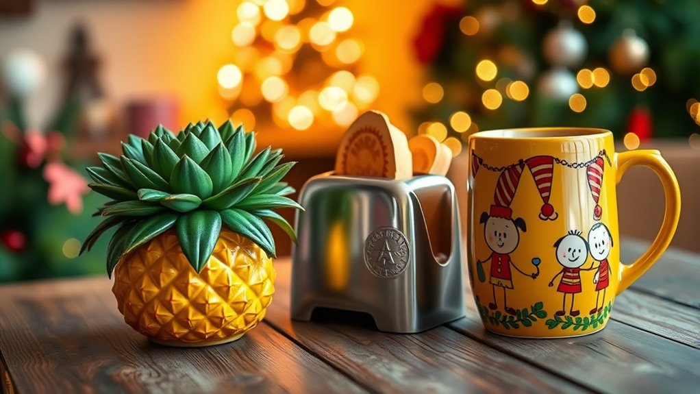 Imagine a giant, squeaky rubber chicken or a mug that says, “World’s Okayest Employee”—that’s my go-to for budget-friendly pranks. I love slipping these into gift exchanges because they’re cheap, hilarious, and guaranteed to get everyone’s attention. No need to break the bank; a little humor goes a long way. Plus, watching someone unwrap a bizarre surprise is priceless. That’s the secret to memorable, funny gifts on a budget!