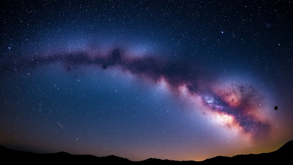Have you ever wondered how the field of view impacts your Milky Way shots? It’s a critical factor because it determines how much of the night sky you can fit into a single frame. A wider field of view allows you to capture more of the Milky Way and create immersive, breathtaking images. Lenses with focal lengths between 14mm and 24mm are ideal, offering broad coverage without distortion. Circular fisheye lenses with a 220° view can produce striking, spherical images that include the entire sky, giving a dramatic effect. The field of view also affects composition, letting you incorporate foreground elements or landscape features. Plus, a larger view reduces the need for multiple shots or stitching, making it easier to capture expansive scenes in one exposure.