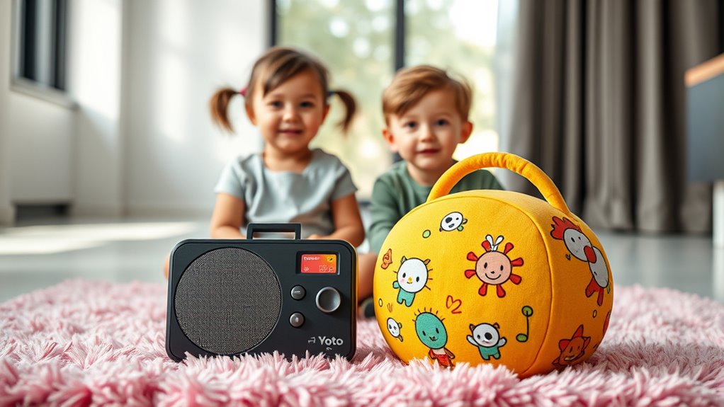 Durability and design are key factors to contemplate when selecting between the Yoto Player and Toniebox, especially since young children tend to handle their devices roughly. A durable device often features shockproof designs and sturdy materials like reinforced plastics or shock-resistant casings, ensuring it can withstand drops and bumps. Compact, kid-friendly shapes with rounded edges not only look appealing but also enhance safety and reduce damage risks during rough handling. Water-resistant or waterproof features are great for active kids and outdoor use, adding extra protection. The overall build quality, including secure buttons and high-quality internal components, influences longevity. Well-designed devices also incorporate textured surfaces or grips, helping prevent slips and accidental drops, making them more resilient for everyday use.