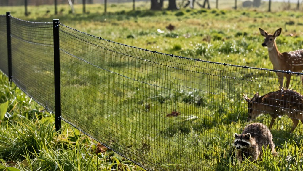 Ever wondered how electric netting keeps pests and animals at bay? It’s a simple yet effective fencing solution that delivers a mild electric shock when animals touch it. The net’s design ensures that the electric current flows safely through the netting, providing solar safety for users and animals alike. The net’s durability is key; high-quality materials resist weather and animal contact, ensuring long-lasting performance. When an animal contacts the net, the electric pulse startles and deters it from crossing, without causing harm. The netting can be installed easily around crops, livestock, or protected areas. Its portability and effectiveness make it a popular choice for reducing wildlife conflicts, all while maintaining safety standards through solar-powered energizers. Leveraging energy-efficient technology, electric netting aligns with sustainable practices to minimize environmental impact. Additionally, understanding regulatory standards helps ensure compliance and safety during installation and use. Modern electric netting systems often incorporate advanced safety features that further protect both animals and users from accidental shocks. Proper installation procedures are essential for maximum efficiency and safety.