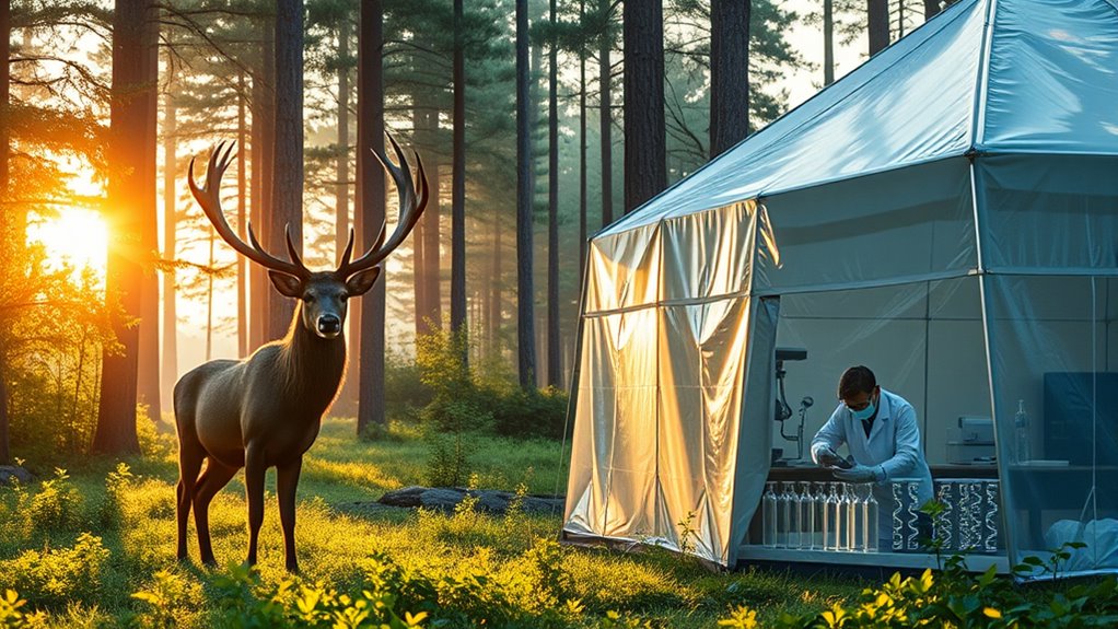 The Deer DNA Banking Project safeguards genetic diversity by collecting and preserving genetic material from wild and captive deer populations. This helps guarantee their resilience by maintaining unique genetic traits that protect against diseases and environmental changes. By building a detailed genetic database, the project supports conservation efforts like habitat restoration, population management, and genetic rescue. To discover how these efforts work together to secure deer’s future, you’ll find more insights below.