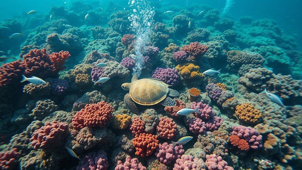Ocean acidification, caused by rising CO₂ levels, dramatically impacts marine life. As the ocean absorbs more CO₂, it forms carbonic acid, reducing carbonate ions essential for organisms like mollusks and corals. This weakens shells and skeletons, threatening survival and reproduction. The decline of corals affects entire ecosystems and the fish that depend on them, potentially damaging fisheries and tourism. There’s much more to uncover about its far-reaching effects and what can be done to help.